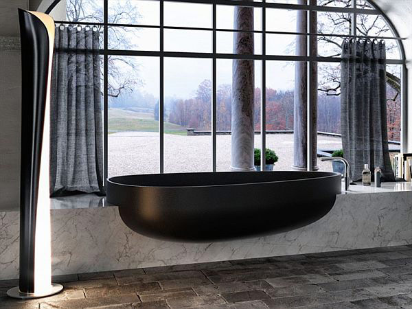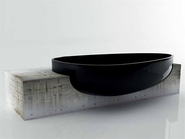 Тонкие линии элегантной черной ванной контрастируют с шероховатой поверхностью монолитного блока-основы. Это органичное взаимодействие двух различных форм и материалов особенно эффектно выглядит на в контексте природы. Будучи установленной на фоне сплошного окна, эта модель в полной мере проявляет достоинства своей элегантной и в меру брутальной простоты.